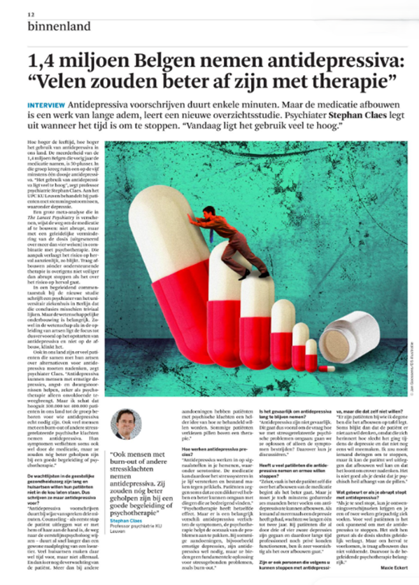 In De Standaard pleit psychiater Stephan Claes voor een kritischer en zorgvuldiger gebruik van antidepressiva. Volgens hem ligt het gebruik in België vandaag te hoog, zeker bij stress- en burn-outklachten. Medicatie kan symptomen verlichten, maar pakt zelden de oorzaak aan.